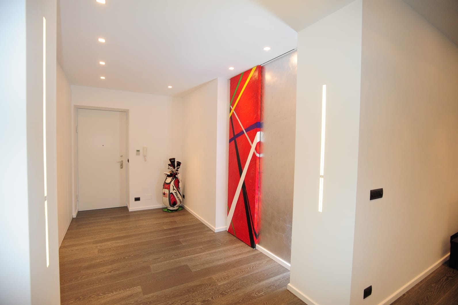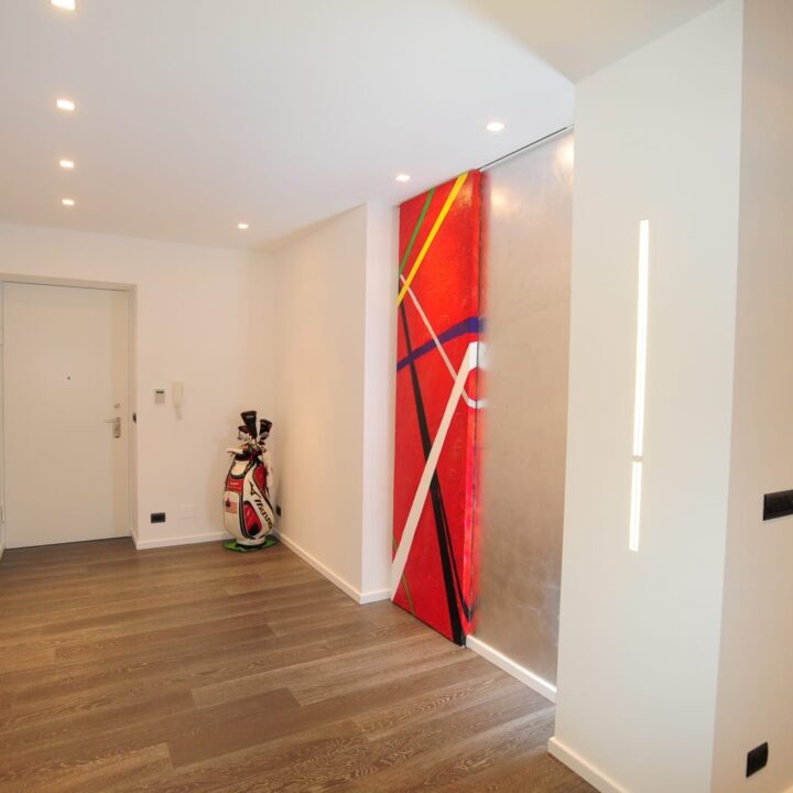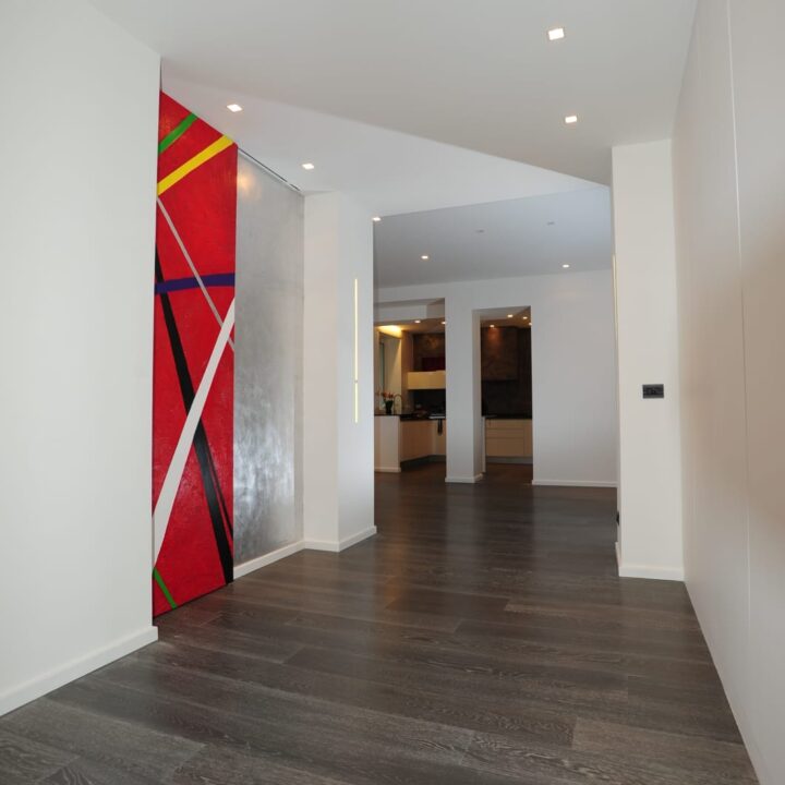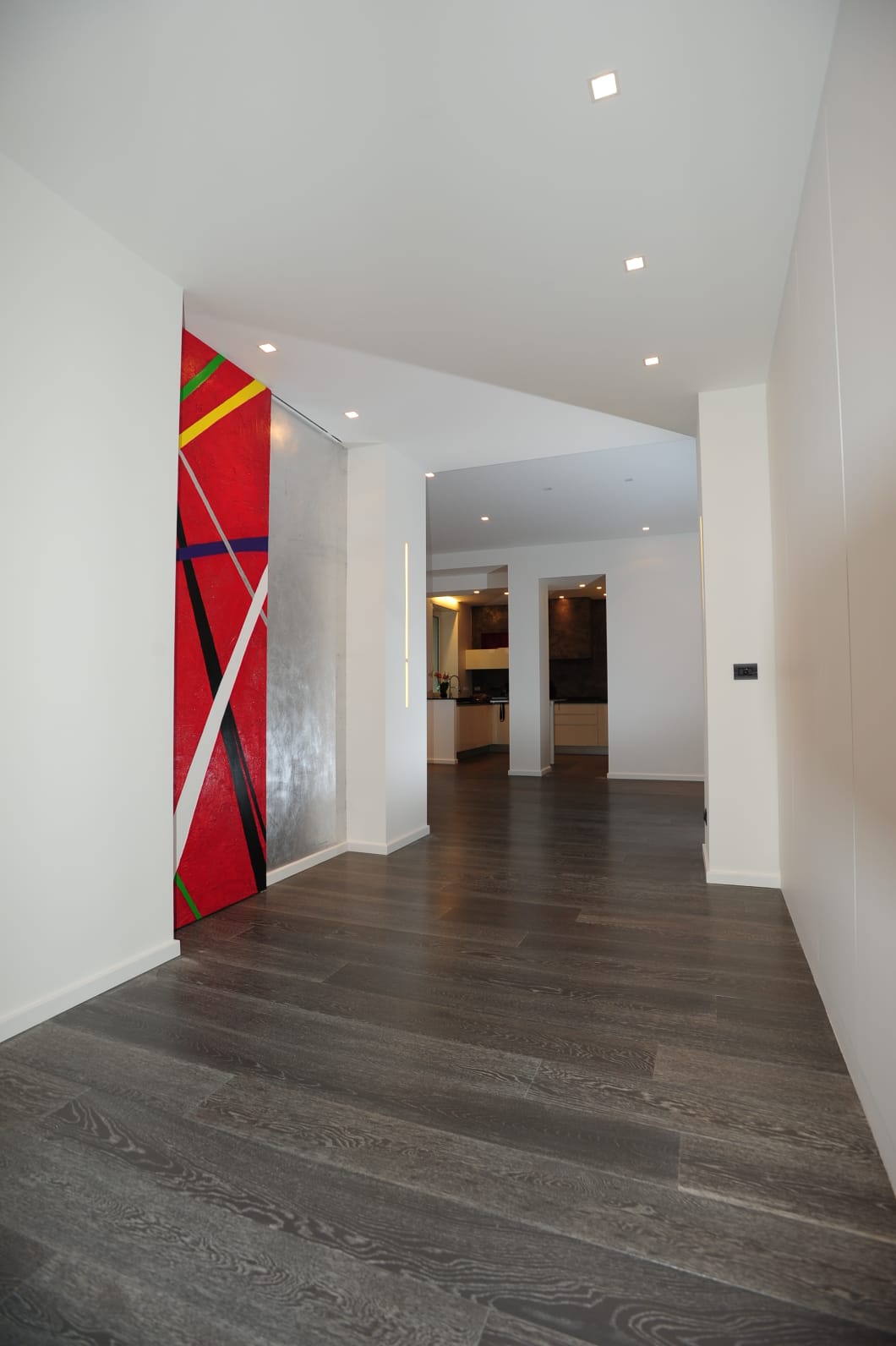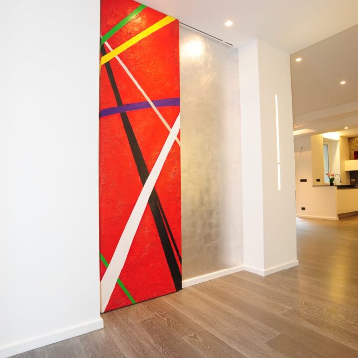 Porta scorrevole decorata in pittorico astratto su parete in foglia argento per abitazione Privata, Torino.