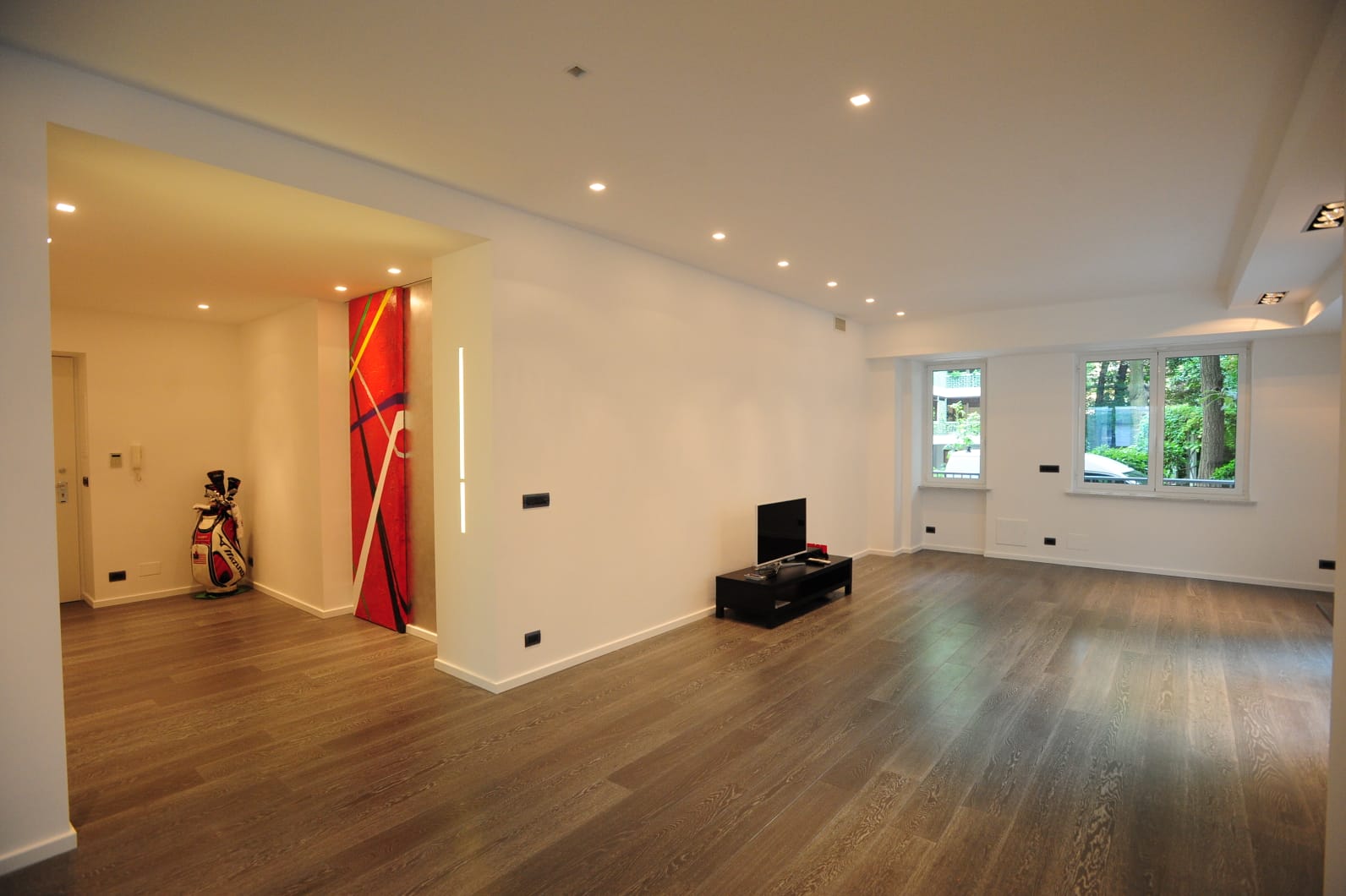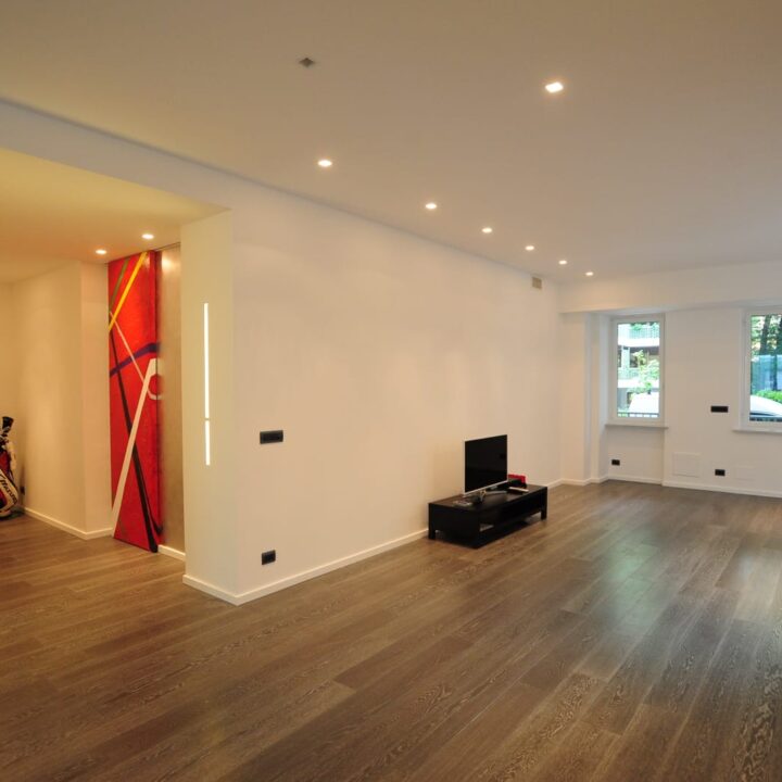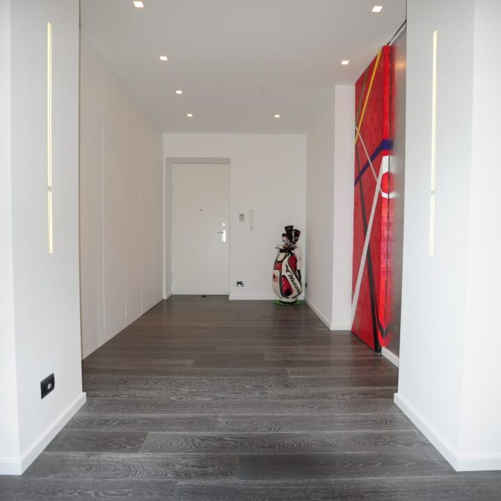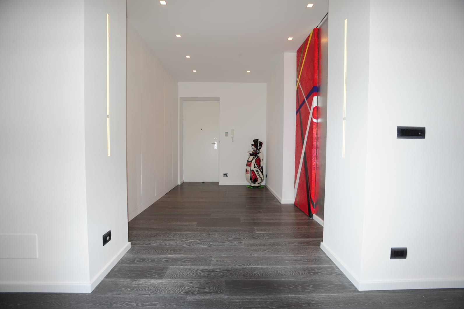 Porta scorrevole decorata in pittorico astratto su parete in foglia argento per abitazione Privata, Torino.